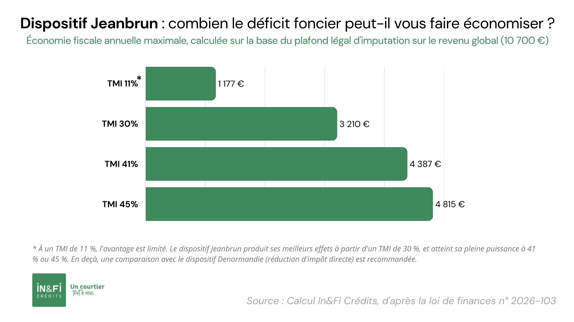 Le mécanisme est le suivant. Les revenus fonciers sont constitués des loyers encaissés. En face, le bailleur peut déduire l’ensemble de ses charges réelles : intérêts d’emprunt, frais de gestion, assurances, taxe foncière. Et, désormais, l’amortissement Jeanbrun. Si le total de ces charges dépasse les loyers perçus, il en résulte un déficit foncier. Celui-ci peut être imputé sur le revenu global du foyer fiscal, dans la limite de 10 700 € par an (ou 21 400 € dans le cadre d’une rénovation énergétique permettant de faire passer un bien classé E, F ou G au niveau A ou B).